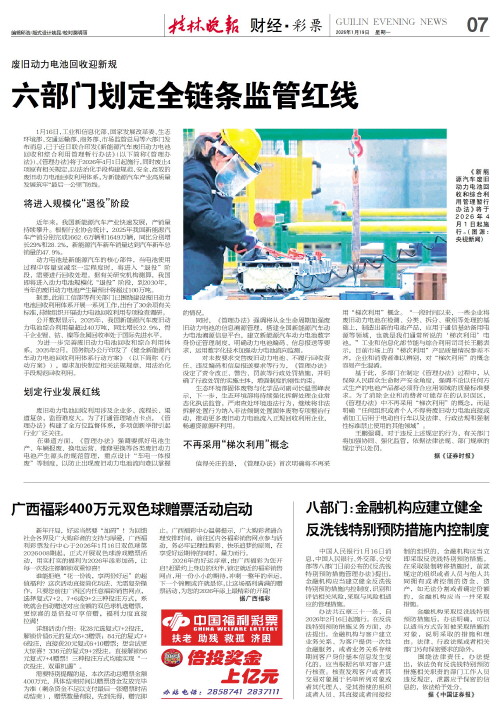 废旧动力电池回收迎新规 六部门划定全链条监管红线   1月16日,工业和信息化部、国家发展改革委、生态环境部、交通运输部、商务部、市场监管总局等六部门发布消息,已于近日联合印发《新能源汽车废旧动力电池回收和综合利用管理暂行办法》(以下简称《管理办法》)。《管理办法》将于2026年4月1日起施行,同时废止4项原有相关规定,以法治化手段构建规范、安全、高效的废旧动力电池回收利用体系,为新能源汽车产业高质量发展筑牢“最后一公里”防线。