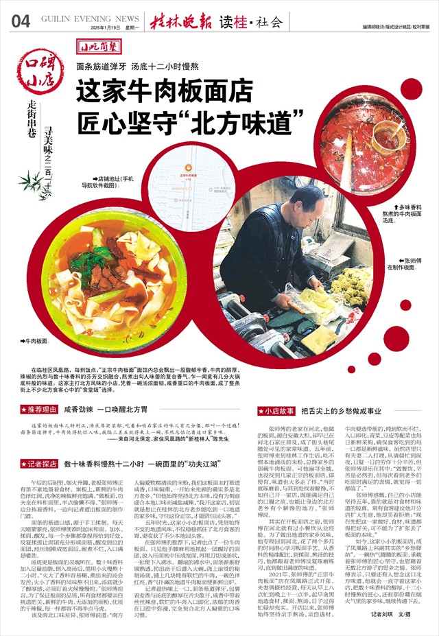 匠心坚守“北方味道”   在临桂区凤凰路,每到饭点,“正宗牛肉板面”面馆内总会飘出一股馥郁辛香,牛肉的醇厚、辣椒的热烈与数十味香料的芬芳交织融合,熬煮出勾人味蕾的复合香气,乍一闻竟有几分火锅底料般的味道。这家主打北方风味的小店,凭着一碗汤浓面韧、咸香重口的牛肉板面,成了整条街上不少北方食客心中的“食堂级”选择。