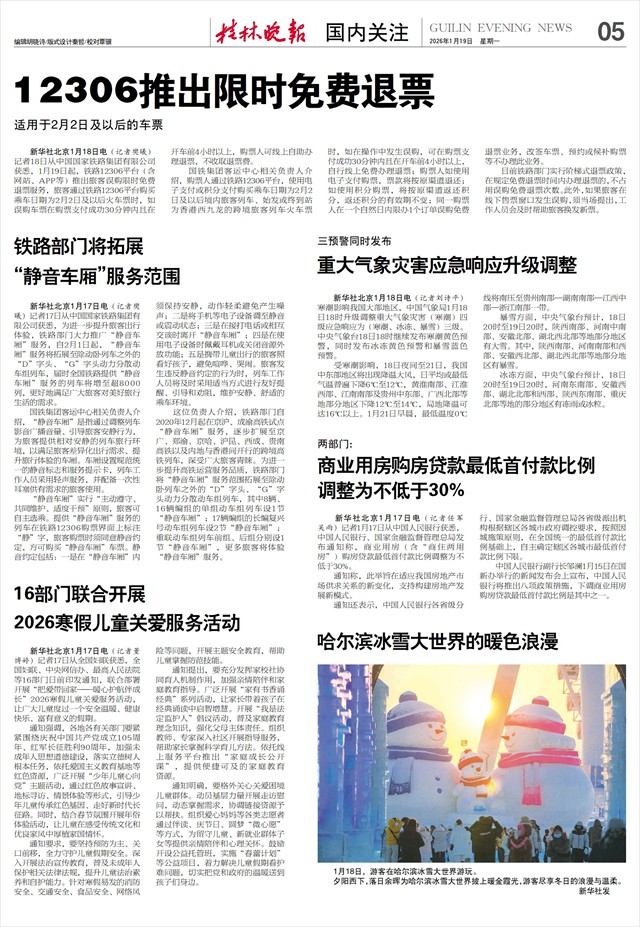 新华社北京1月17日电(记者樊曦)记者17日从中国国家铁路集团有限公司获悉,为进一步提升旅客出行体验,铁路部门大力推广“静音车厢”服务,自2月1日起,“静音车厢”服务将拓展至除动卧列车之外的“D”字头、“G”字头动力分散动车组列车,届时全国铁路提供“静音车厢”服务的列车将增至超8000列,更好地满足广大旅客对美好旅行生活的需求。