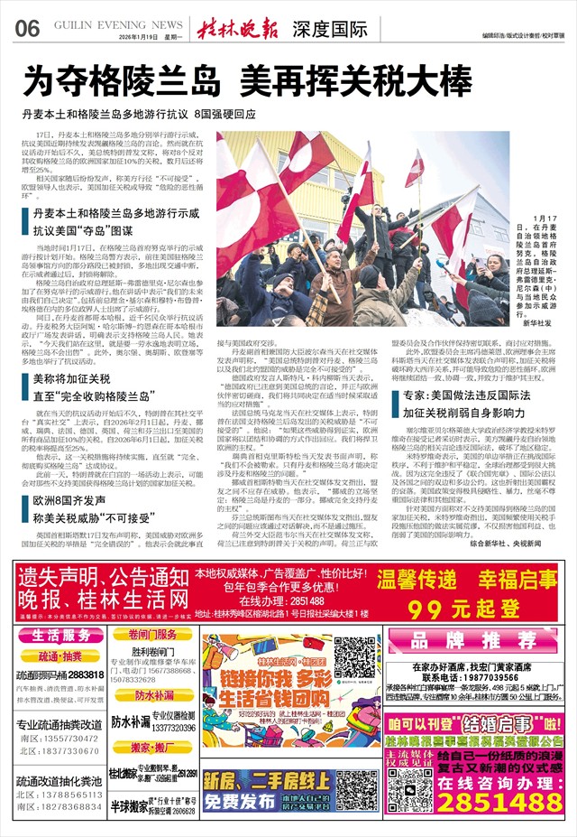 就在当天的抗议活动开始后不久,特朗普在其社交平台“真实社交”上表示,自2026年2月1日起,丹麦、挪威、瑞典、法国、德国、英国、荷兰和芬兰出口至美国的所有商品加征10%的关税。自2026年6月1日起,加征关税的税率将提高至25%。