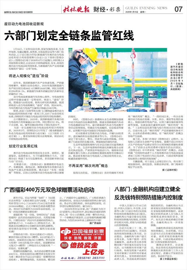 1月16日,工业和信息化部、国家发展改革委、生态环境部、交通运输部、商务部、市场监管总局等六部门发布消息,已于近日联合印发《新能源汽车废旧动力电池回收和综合利用管理暂行办法》(以下简称《管理办法》)。《管理办法》将于2026年4月1日起施行,同时废止4项原有相关规定,以法治化手段构建规范、安全、高效的废旧动力电池回收利用体系,为新能源汽车产业高质量发展筑牢“最后一公里”防线。