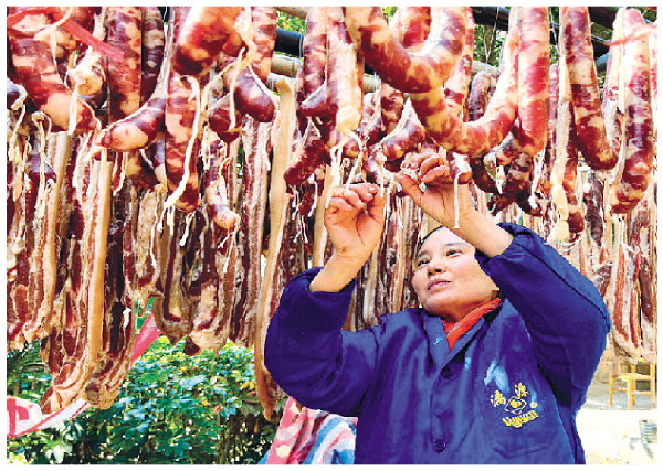 年节将至,腊味飘香,临桂区两江镇两江村委菜园村谢惠恩是一位腊味制作“大户”,她家里挂着一串串色泽红润的腊肠、一块块油光锃亮的腊肉,空气中弥漫着肉香与甘蔗清甜交织的独特气息。立冬至今,她已经制作了腊肠、腊肉、腊猪脚等多个品种。