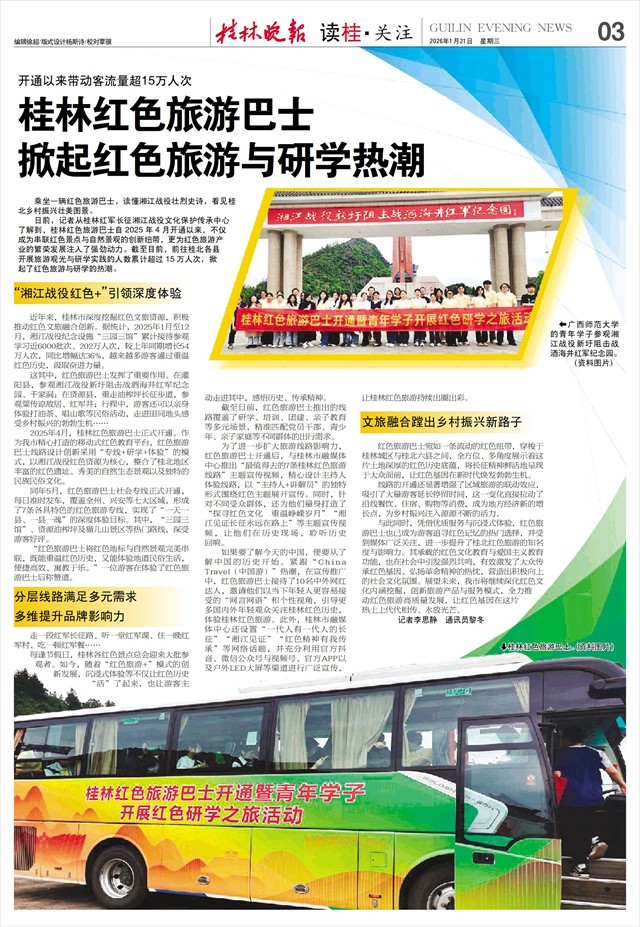 日前,记者从桂林红军长征湘江战役文化保护传承中心了解到,桂林红色旅游巴士自2025年4月开通以来,不仅成为串联红色景点与自然景观的创新纽带,更为红色旅游产业的繁荣发展注入了强劲动力。截至目前,前往桂北各县开展旅游观光与研学实践的人数累计超过15万人次,掀起了红色旅游与研学的热潮。