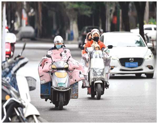 近日,受强冷空气影响,桂林气温骤降。21日的穿山东路上,不少骑电单车出行的市民纷纷“全副武装”,应对寒潮来袭。 记者滕嘉 摄