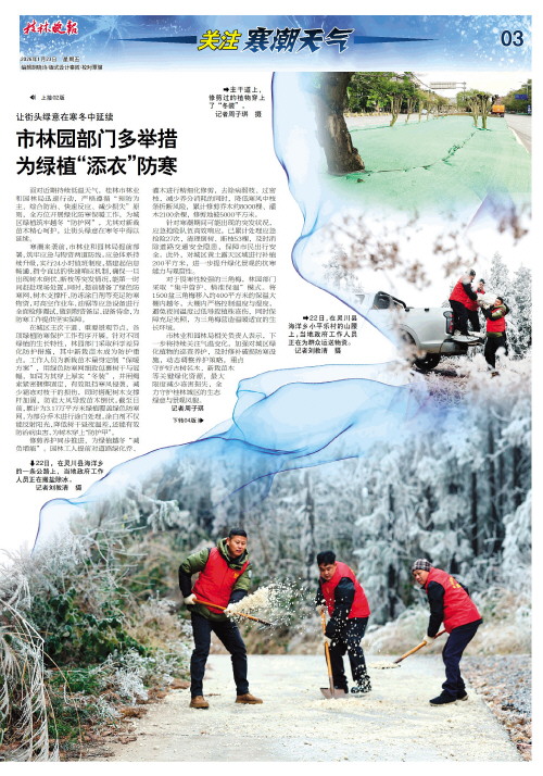 市林业和园林局相关负责人表示,下一步将持续关注气温变化,加强对城区绿化植物的巡查养护,及时修补破损防寒设施,动态调整养护策略,重点守护好古树名木、新栽苗木等关键绿化资源,最大限度减少冻害损失,全力守护桂林城区的生态绿意与景观风貌。