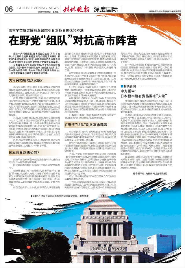 高市早苗决定解散众议院引日本各界担忧和不满 在野党“组队”对抗高市阵营   据日本共同社报道,日本国会众议院1月22日宣布,众议院的立宪民主党党派与公明党党派解散,新党派“中道改革联合”组建。在即将举行的众议院选举中,该党将作为最大在野党与执政党阵营争夺议席。
