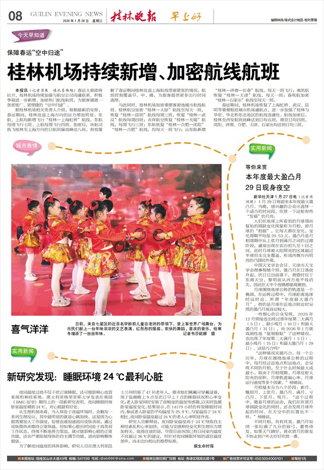 春运期间,桂林机场恢复了上海虹桥、武汉、昆明等重要枢纽城市机场通航点,进一步加强了桂林与华东、华北和东北地区的航线连通性。航线加密后,桂林至西安航班高峰达到日均五班,南京日均四班,沈阳、济南、合肥、天津、石家庄均达到日均三班。