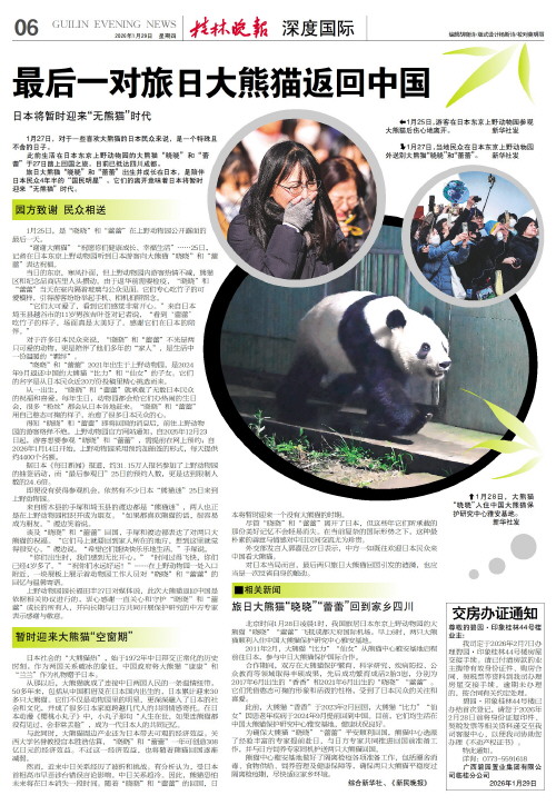 最后一对旅日大熊猫返回中国 日本将暂时迎来“无熊猫”时代   1月27日,对于一些喜欢大熊猫的日本民众来说,是一个特殊且不舍的日子。