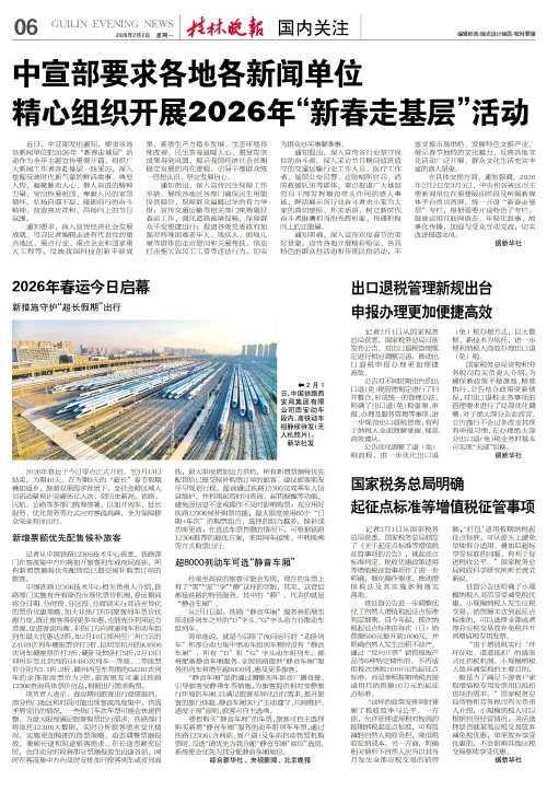 精心组织开展2026年“新春走基层”活动   近日,中宣部发出通知,要求各地各新闻单位把2026年“新春走基层”活动作为全年主题宣传重要开篇,组织广大新闻工作者奔赴基层一线采访,深入挖掘反映时代新气象的鲜活故事、典型人物,凝聚触动人心、催人奋进的精神力量,突出热爱祖国、奉献人民的家国情怀,弘扬自强不息、砥砺前行的奋斗精神,营造喜庆祥和、昂扬向上的节日氛围。