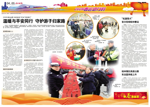 2月2日,2026年春运大幕如期拉开。桂林北站站前广场,人潮渐起,年味渐浓。桂林市公安局交通管理支队联合象山区政协、桂林北站派出所共同启动“平安春运·温暖同行”主题活动。为期40天的春运里,桂林市多部门正以高标准、严要求、扎实举措、暖心服务,全力保障每一条道路的安全有序畅通,用心守护每一位游子的平安温暖归途。