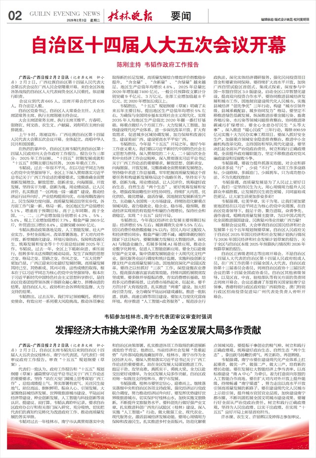 广西云-广西日报2月2日讯(记者龚文颖 钟小启)2月2日,自治区主席韦韬先后来到自治区十四届人大五次会议桂林市、南宁市代表团,与代表们一同审议政府工作报告,审查“十五五”规划纲要(草案)。