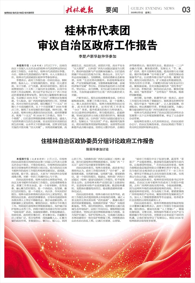 自治区政协常委、桂林市政协主席陈丽华说,自治区主席韦韬所作的政府工作报告,总结成绩客观全面,部署工作务实奋进,是一个高举旗帜、攻坚克难、凝心聚力的好报告,是一个讲政治、促发展、惠民生的好报告,是一个成效大、亮点多、作风实的好报告。桂林市政协系统将在政治方向上更加坚定,按照自治区党委、政府的部署要求,引导各党派团体和各族各界人士坚定不移跟党走、携手奋进新征程;在创新履职上更加有效,聚焦自治区、桂林市今年重点工作,特别是打造桂林世界级旅游城市、保护漓江保护桂林山水等工作,持续开展好各项委员专项行动和“双联双创”活动,加强视察调研,积极监督建言,协助党委、政府把好事办好、把实事办实;在凝聚共识上更加广泛,充分发挥统一战线凝聚人心、汇聚力量的政治作用,多做强信心、聚民心、暖人心、筑同心的工作,为助推科创广西先行试验区(桂林)建设、助力打造桂林世界级旅游城市、实现广西“十五五”良好开局贡献更多智慧和力量。