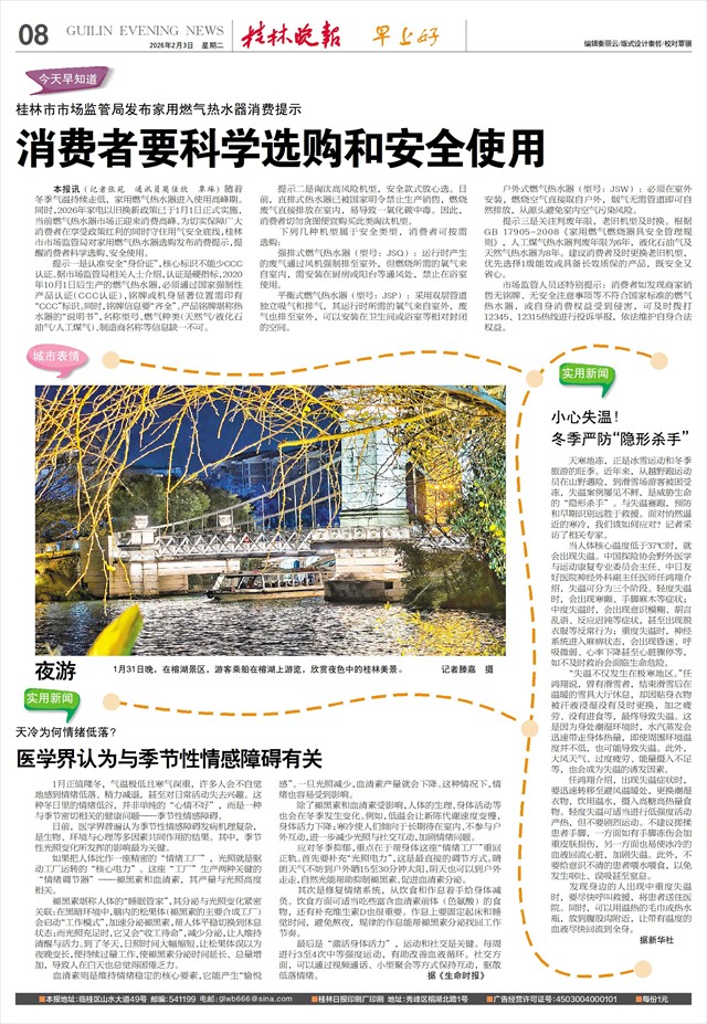 桂林市市场监管局发布家用燃气热水器消费提示 消费者要科学选购和安全使用   本报讯(记者张苑 通讯员莫佳欣 覃琢)随着冬季气温持续走低,家用燃气热水器进入使用高峰期。同时,2026年家电以旧换新政策已于1月1日正式实施,当前燃气热水器市场正迎来消费高峰。为切实保障广大消费者在享受政策红利的同时守住用气安全底线,桂林市市场监管局对家用燃气热水器选购发布消费提示,提醒消费者科学选购、安全使用。