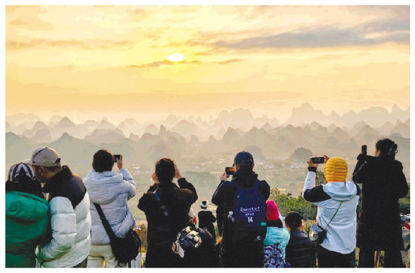 近日,在阳朔葡萄镇杨梅岭上,来自各地的游人打卡夕阳下的“千里江山图”美景。