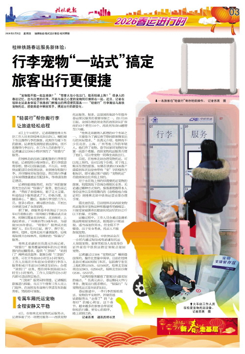 “宠物能不能一起坐高铁?”“带着大包小包出门,能否轻装上阵?”很多人的春运记忆,总与沉重的行李,不能与自己心爱的宠物同行捆绑在一起。近日,记者在桂林北站亲身体验了铁路部门新推出的两项便民服务——“轻装行”行李搬运与高铁宠物托运,感受旅途中解放双手、携宠出行的新变化。
