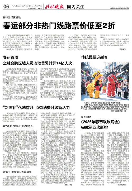记者从中国国家铁路集团有限公司获悉,2月8日全国铁路预计发送旅客1325万人次,计划加开旅客列车1688列,其中在京广、京沪、京哈等主要高铁通道增开夜间高铁列车,对春运部分非热门线路车票实行最低2折优惠票价,为旅客出行提供更多选择。