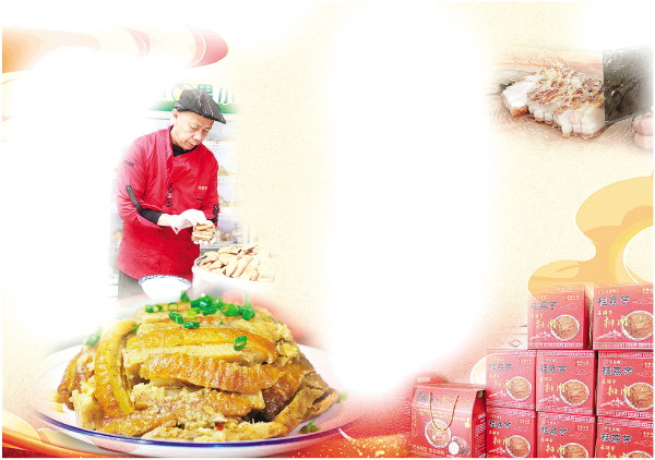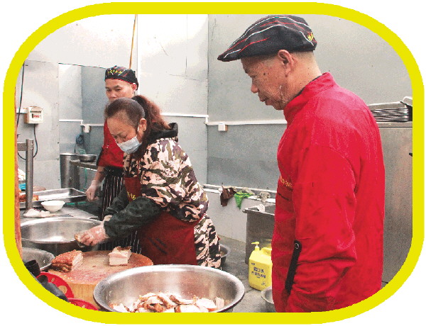 ↑何昭兵(右)指导徒弟将油炸后的五花肉切成片。