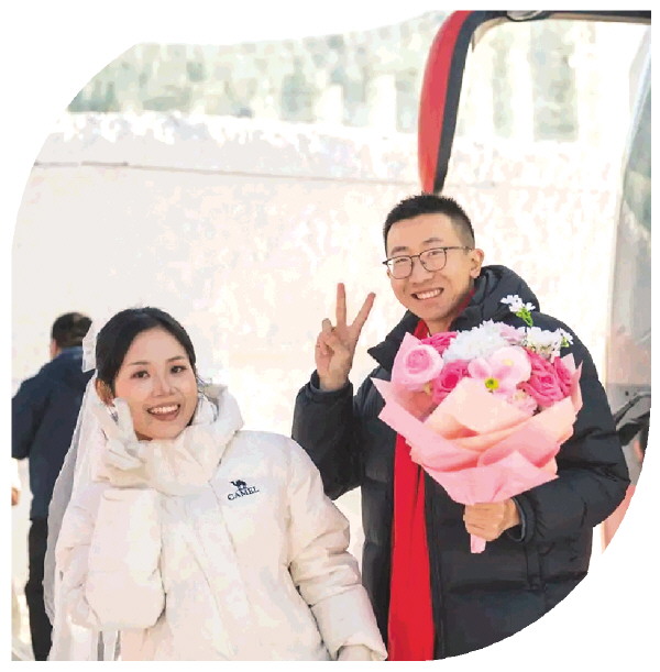 ↑近日,在哈尔滨冰雪大世界园区,新人参加公益冰雪集体婚礼。