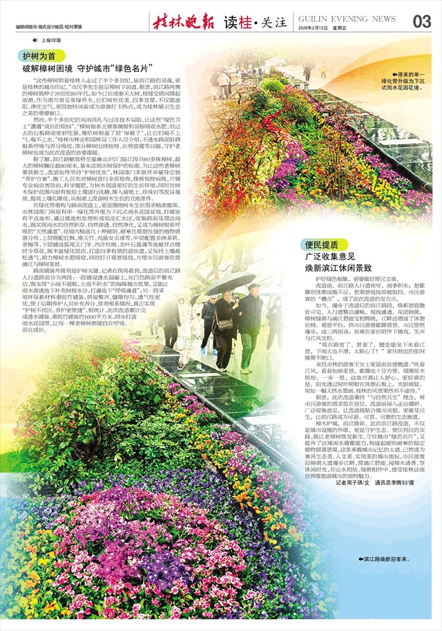 守护“绿色名片” 做好便民文章 滨江路焕新迎客来   清风拂岸,樟香满径。2月10日,经过精心改造的滨江路解放桥至象山公园3号门褪去施工围挡“外衣”,以焕然一新的姿态静待宾客。道路两侧,20世纪60年代栽种的樟树依旧枝繁叶茂,如绿色穹顶与漓江山水相映成趣;脚下,透水铺装与重组竹步道错落延伸,雨水花园繁花点缀;江畔,增设了休憩长椅、观景平台,让市民可以漫步赏景、游客驻足打卡。此次改造以守护滨江路樟树这张城市“绿色名片”为核心,同步优化休闲空间,让这条承载桂林记忆的滨江大道,既留住绿色根脉,又焕发时代生机。