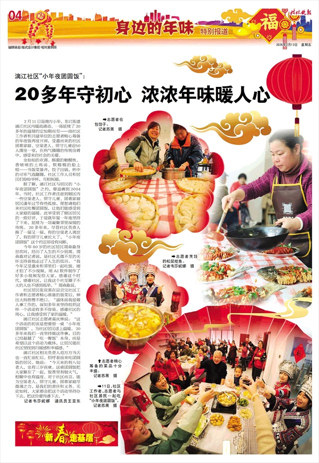 漓江社区“小年夜团圆饭”: 20多年守初心 浓浓年味暖人心   2月11日是南方小年,东江街道漓江社区内暖流涌动。一场延续了20多年的温情约定如期而至——由社区工作者和共建单位的志愿者精心筹备的年夜饭再度开席,受邀而来的社区困难家庭、空巢老人、留守儿童近50人围坐一堂,在热气腾腾的传统佳肴中,感受来自社会的关爱。