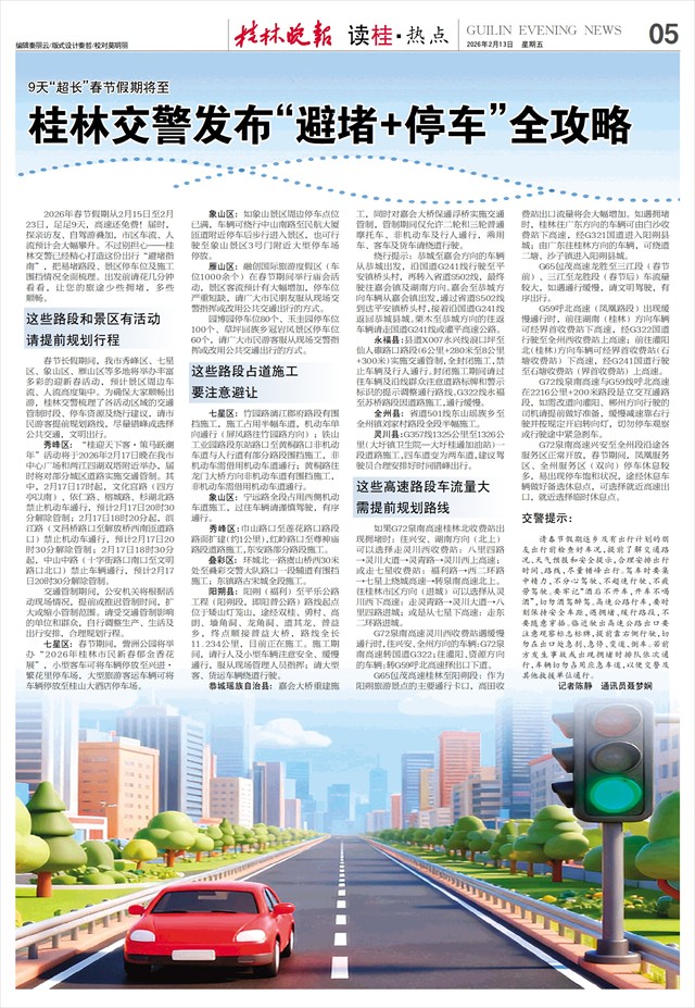 9天“超长”春节假期将至 桂林交警发布“避堵+停车”全攻略   2026年春节假期从2月15日至2月23日,足足9天,高速还免费!届时,探亲访友、自驾游叠加,市区车流、人流预计会大幅攀升。不过别担心——桂林交警已经精心打造这份出行“避堵指南”,把易堵路段、景区停车位及施工围挡情况全面梳理。出发前请花几分钟看看,让您的旅途少些拥堵,多些顺畅。