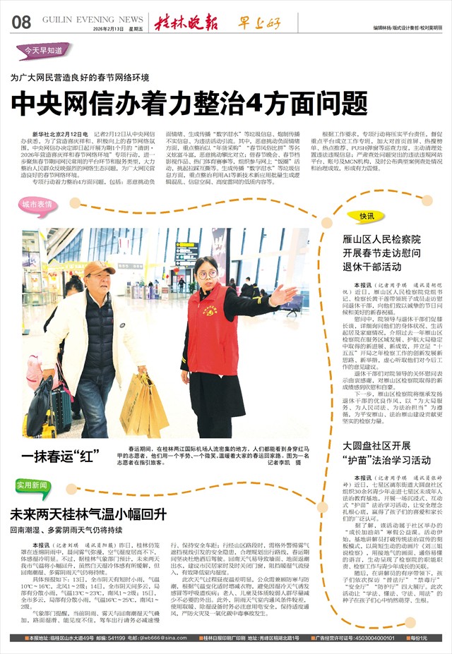 春风送暖,万象更新。随着“平安桂林法治桂林文明桂林”新春系列行动的全面启动与深入推进,这股和煦的文明春风、坚实的法治力量、温暖的平安守护,将如春风化雨浸润桂林的每一个角落,护航市民度过一个安心、暖心、开心的新春佳节,共同绘制出这座城市更加美好、和谐、幸福的生活新图景。