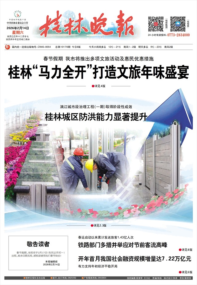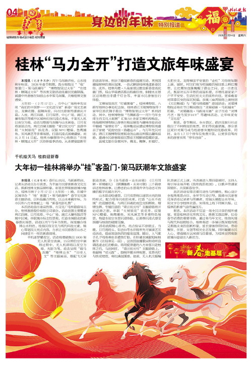桂林“马力全开”打造文旅年味盛宴   本报讯(记者李思静)丙午马年蹄声疾,山水桂林年味浓。2026年春节假期,我市将推出“‘桂’客盈门·策马跃潮年”“博物馆里过大年”“在桂林·顺翔过大年”等各类文旅活动及惠民优惠措施,诚邀中外游客在如画山水中策马奔腾,共飨桂林文旅盛宴。