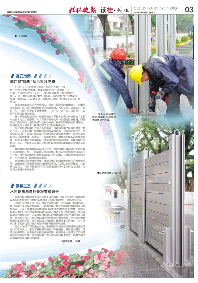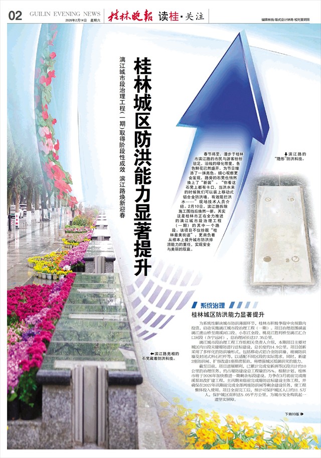 漓江城市段治理工程(一期)取得阶段性成效 滨江路焕新迎春 桂林城区防洪能力显著提升   春节将至,漫步于桂林市滨江路的市民与游客纷纷驻足,沿线的绿化带里,各色鲜花已然盛开,为节日增添了一抹亮色。细心观察更会发现,路旁的石凳也悄然换上了“新装”。“你看这石凳上都有卡口,当洪水来的时候我们可以装上移动式铝合金防洪墙,有效阻拦洪水……”现场技术人员介绍。2月10日,滨江路拆除施工围挡后焕然一新,其实这是桂林市正在全力推进的漓江城市段治理工程(一期)的其中一个路段。该项目不仅扮靓“桂林最美街道”,更肩负着从根本上提升城市防洪排涝能力的重任,实现安全与美丽的双赢。