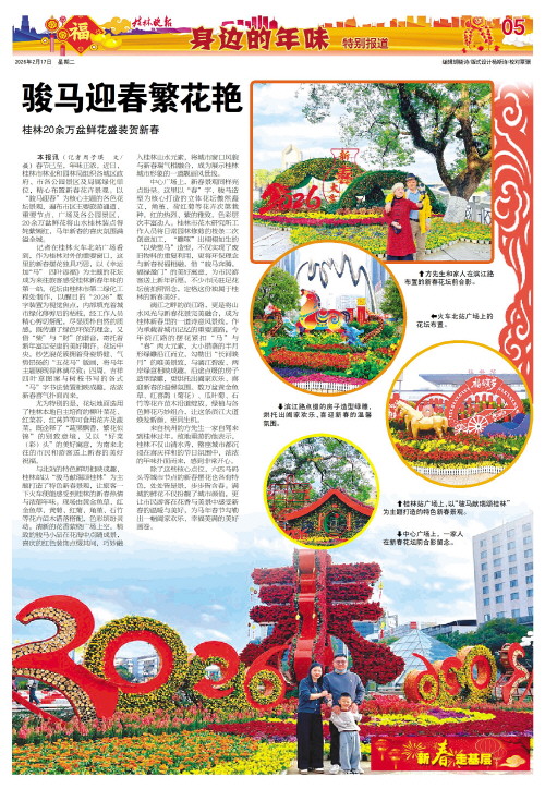 本报讯(记者周子琪 文/摄)春节已至,年味正浓。近日,桂林市林业和园林局组织各城区政府、市各公园景区及局属绿化单位,精心布置新春花卉景观。以“骏马迎春”为核心主题的各色花坛景观,遍布市区主要旅游通道、重要节点、广场及各公园景区,20余万盆鲜花将山水桂林装点得姹紫嫣红,马年新春的喜庆氛围满溢全城。