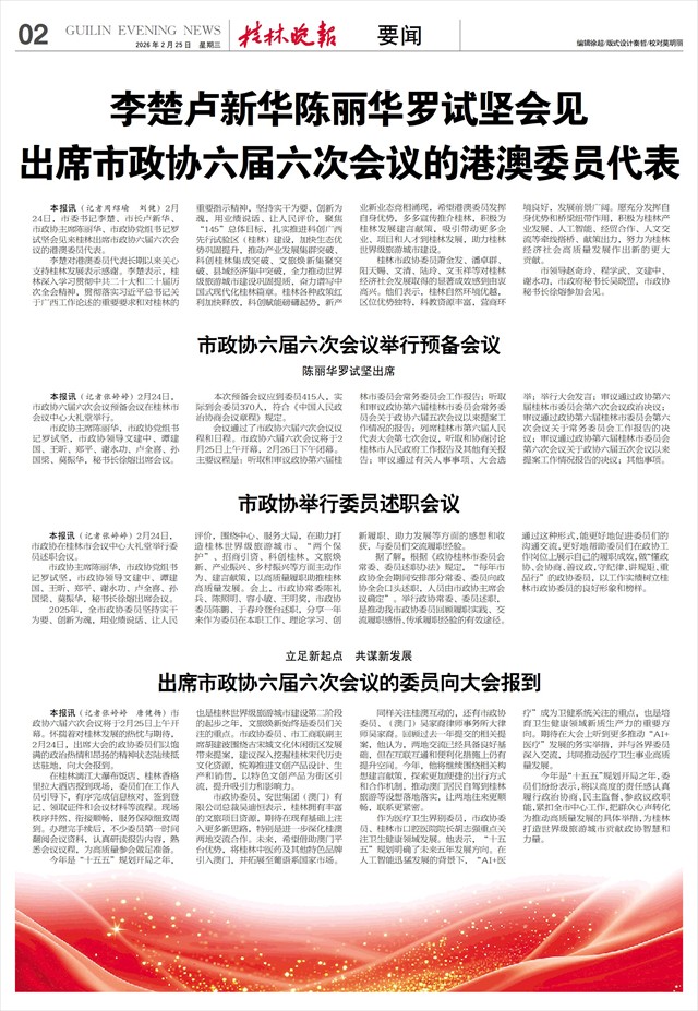 立足新起点 共谋新发展 出席市政协六届六次会议的委员向大会报到   本报讯(记者张婷婷 唐健扬)市政协六届六次会议将于2月25日上午开幕。怀揣着对桂林发展的热忱与期待,2月24日,出席大会的政协委员们以饱满的政治热情和昂扬的精神状态陆续抵达驻地,向大会报到。