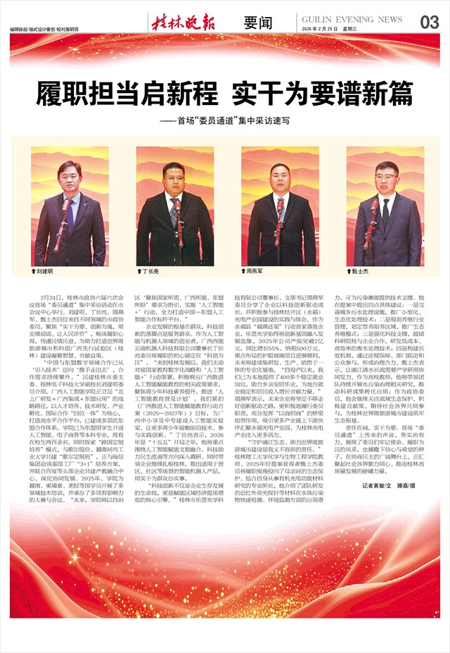 履职担当启新程 实干为要谱新篇 ——首场“委员通道”集中采访速写   2月24日,桂林市政协六届六次会议首场“委员通道”集中采访活动在市会议中心举行。刘建明、丁长亮、周燕军、甄士杰四位来自不同领域的市政协委员,聚焦“实干为要、创新为魂,用业绩说话、让人民评价”,畅谈履职心得,传递民情民意,为助力打造世界级旅游城市和科创广西先行试验区(桂林)建设凝聚智慧、贡献良策。