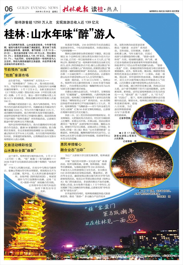 接待游客超1250万人次 实现旅游总收入近139亿元 桂林:山水年味“醉”游人   金马奔腾开胜景,山水诚意迎客来。今年春节假期,暖阳与春风不仅唤醒了满城繁花,更点燃了市民游客的出游热情。据测算,春节假期(2月15日—23日),我市接待游客1253.69万人次,同比增长33.3%;实现旅游总收入138.94亿元,同比增长33.7%。与此同时,在桂林呈现的一场场科技与人文交织、传统与潮流碰撞的文旅盛宴,向世界展示着这座城市的全新活力。