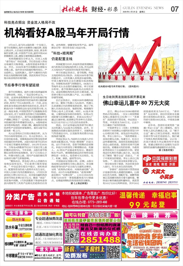 光大证券则从日历效应角度分析,认为节后市场有望震荡上行。光大证券表示,从历史经验来看,受微观流动性好转及投资者风险偏好抬升影响,A股市场在春节后的20个交易日里通常表现较好。2012年至2025年,万得全A指数春节后20个交易日里上涨的概率达到75%。今年来看,A股在春节假期后表现同样值得期待。除了日历效应之外,外围市场的上涨、国内产业端的催化等也将对行情产生积极影响。