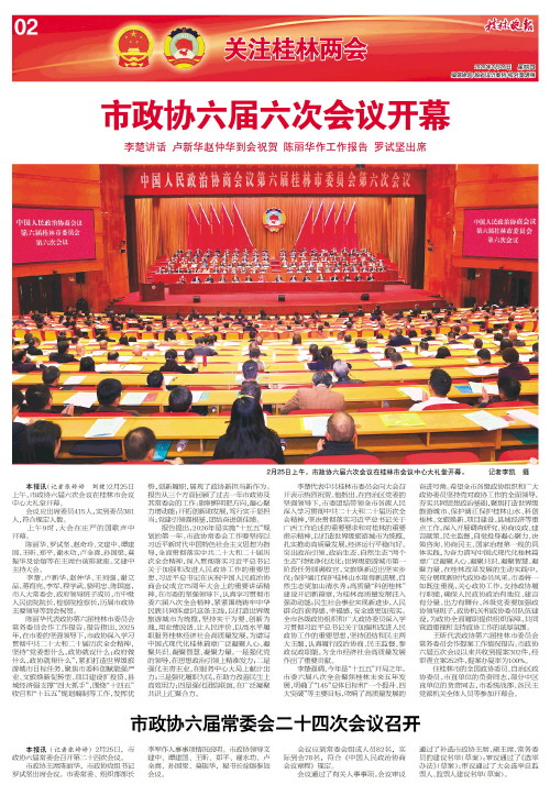 市政协六届六次会议进行大会发言 李楚卢新华赵仲华陈丽华罗试坚出席   本报讯(记者张婷婷)2月25日,市政协六届六次会议在桂林市会议中心大礼堂进行大会发言。8位市政协委员围绕桂林经济社会高质量发展和人民群众关心关注的热点问题作大会发言。