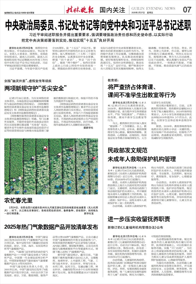 进一步压实收留抚养职责 新修订的《儿童福利机构管理办法》公布   新华社北京2月26日电(记者朱高祥)记者2月26日从民政部获悉,新修订的《儿童福利机构管理办法》近日公布。办法共计7章64条,较之前增加12条、修改43条,涉及进一步压实收留抚养职责、拓展社会服务功能、强化机构内部管理等内容,自2026年4月1日起施行。