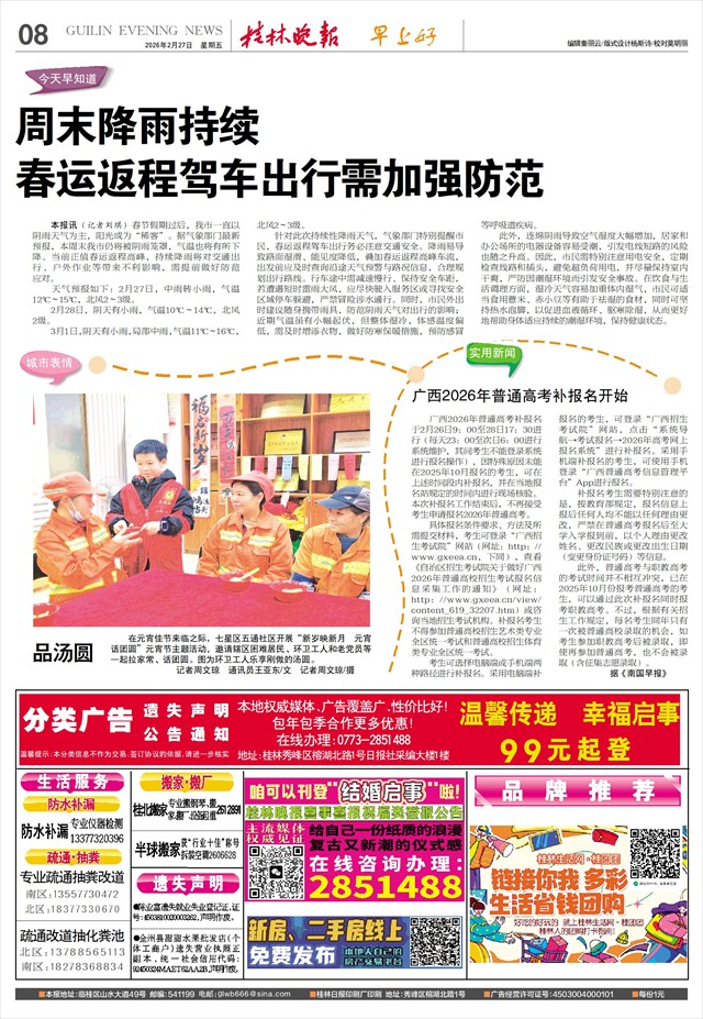 针对此次持续性降雨天气,气象部门特别提醒市民,春运返程驾车出行务必注意交通安全。降雨易导致路面湿滑、能见度降低,叠加春运返程高峰车流,出发前应及时查询沿途天气预警与路况信息,合理规划出行路线。行车途中需减速慢行、保持安全车距,若遭遇短时雷雨大风,应尽快驶入服务区或寻找安全区域停车躲避,严禁冒险涉水通行。同时,市民外出时建议随身携带雨具,防范阴雨天气对出行的影响;近期气温虽有小幅起伏,但整体湿冷,体感温度偏低,需及时增添衣物,做好防寒保暖措施,预防感冒等呼吸道疾病。