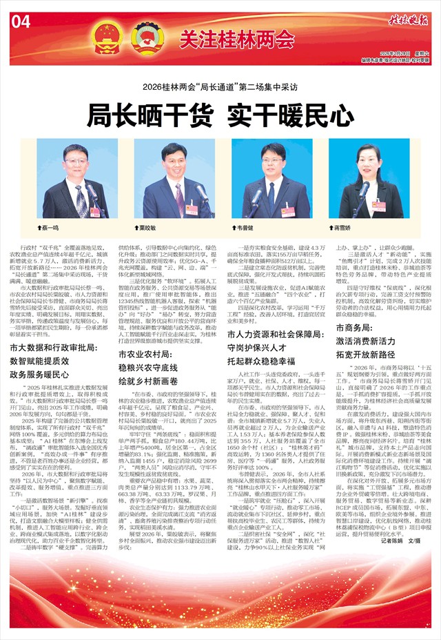 市大数据和行政审批局局长蔡一鸣、市农业农村局局长粟皎敏、市人力资源和社会保障局局长韦普健、市商务局局长蒋雪娇先后接受采访,直面群众关切、亮出年度实绩、明确发展目标,用翔实数据、务实举措,传递政策温度与发展信心,每一项举措都紧扣民生期盼,每一份承诺都彰显着实干担当。