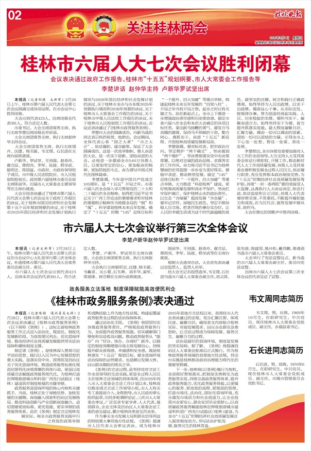 桂林市六届人大七次会议胜利闭幕 会议表决通过政府工作报告、桂林市“十五五”规划纲要、市人大常委会工作报告等