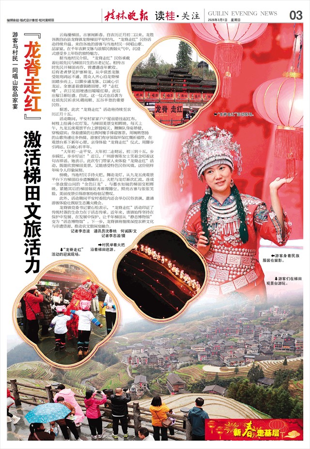 “大年初一走平安,大年初二走财运,初三到十五,步步踩红,步步好运!”近日,广州游客陈女士笑着念叨着这句吉祥话。她表示,此次专门带家人来体验“龙脊走红”活动,既能欣赏梯田美景,又能感受特色民俗风情,这份别样年味令人印象深刻。