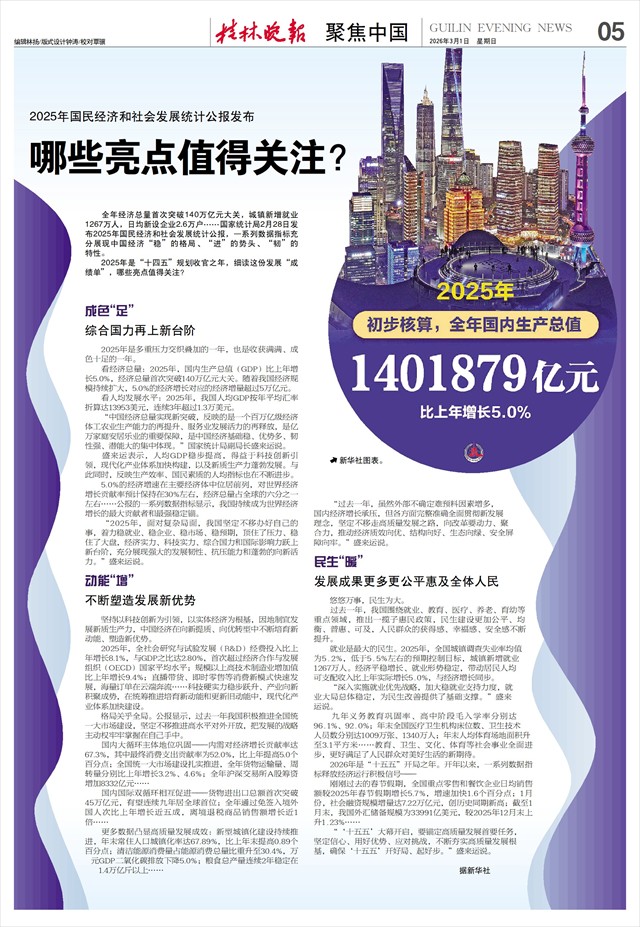 2025年国民经济和社会发展统计公报发布 哪些亮点值得关注?   全年经济总量首次突破140万亿元大关,城镇新增就业1267万人,日均新设企业2.6万户……国家统计局2月28日发布2025年国民经济和社会发展统计公报,一系列数据指标充分展现中国经济“稳”的格局、“进”的势头、“韧”的特性。