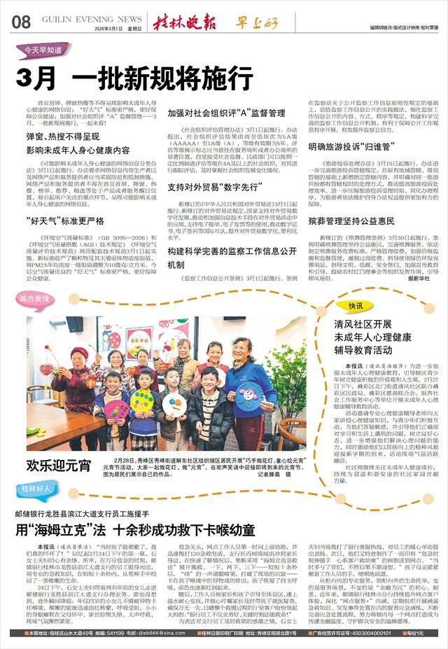 邮储银行龙胜县滨江大道支行员工施援手 用“海姆立克”法 十余秒成功救下卡喉幼童   本报讯(通讯员廖洁)“当时孩子脸都紫了,我们真的吓坏了!”回忆起2月24日下午的那一幕,石女士夫妇仍心有余悸。所幸,在万分危急的时刻,邮储银行桂林市龙胜县滨江大道支行的员工挺身而出,用专业的急救知识,在短短十余秒内,从死神手中抢回了一条稚嫩的生命。