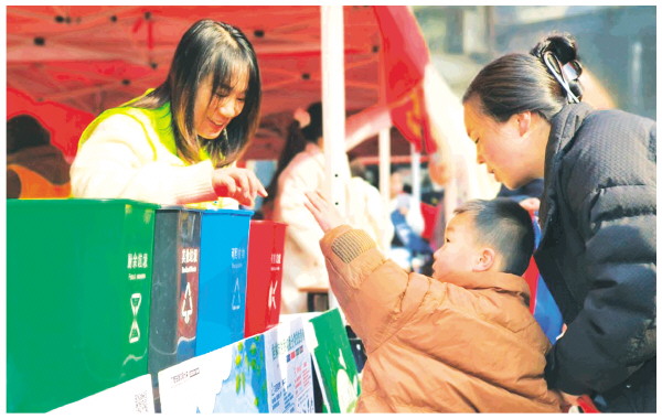 3月4日,由七星区委社会工作部主办,东江街道、羊角山社区承办的“学雷锋·做志愿·共同奋进‘十五五’”志愿服务月主题志愿服务活动在彰泰睿城小广场拉开帷幕。图为志愿者以有奖游戏的方式向居民普及垃圾分类知识。 记者韦莎妮娜 摄