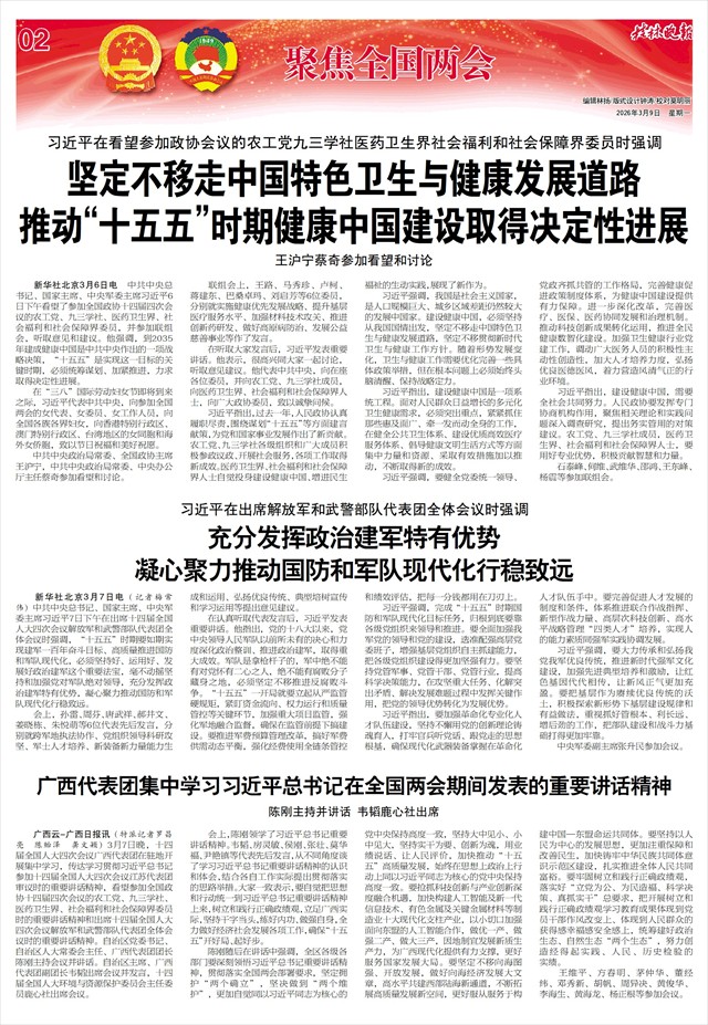 陈刚随后在讲话中强调,全区各级各部门要深刻领悟习近平总书记重要讲话精神,贯彻落实全国两会部署要求,坚定拥护“两个确立”,坚决做到“两个维护”,更加自觉同以习近平同志为核心的党中央保持高度一致,坚持大中见小、小中见大,坚持实干为要、创新为魂,用业绩说话、让人民评价,加快推动“十五五”高质量发展,始终在思想上政治上行动上同以习近平同志为核心的党中央保持高度一致。要抢抓科技创新与产业创新深度融合机遇,加快构建人工智能及新一代信息技术、有色金属及关键金属材料等制造业十大现代化支柱产业,以小切口加强面向东盟的人工智能合作,做优一产、做强二产、做大三产,因地制宜发展新质生产力,为广西现代化提供有力支撑,更好服务国家发展大局。要坚定不移向海图强、开放发展,做好向海经济发展大文章,高水平共建西部陆海新通道,不断拓展高质量发展新空间,更好服从服务于构建中国—东盟命运共同体。要坚持以人民为中心的发展思想,更加注重保障和改善民生,加快铸牢中华民族共同体意识示范区建设,扎实推进全体人民共同富裕。要牢固树立和践行正确政绩观,落实好“立党为公、为民造福、科学决策、真抓实干”总要求,把开展树立和践行正确政绩观学习教育成果体现到党员干部作风改变上、体现到人民群众的获得感幸福感安全感上,统筹建好政治生态、自然生态“两个生态”,努力创造经得起实践、人民、历史检验的实绩。