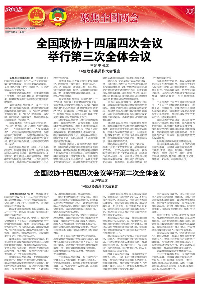 新华社北京3月8日电 全国政协十四届四次会议8日下午在人民大会堂举行第三次全体会议。中共中央政治局常委、全国政协主席王沪宁出席会议。14位政协委员作大会发言。