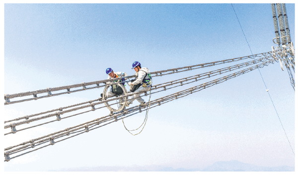 近日,我国“西电东送”重要通道——±800千伏特高压金塘线启动全面检修。在安徽省铜陵市枞阳县长江边,检修工人穿戴专业防护设备,在最高达345米的特高压输电线路上攀爬走线、精心作业,保障输电线路安全。 新华社发