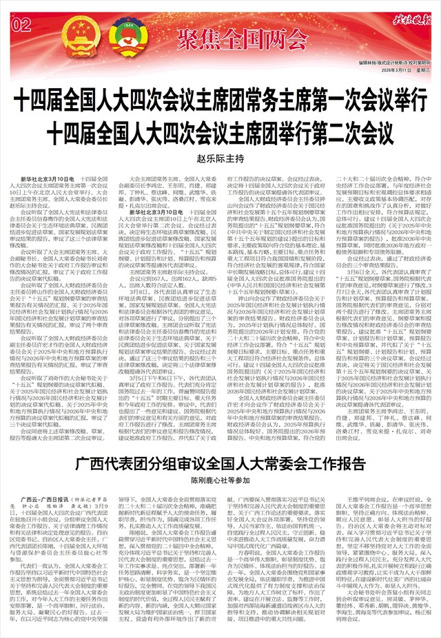 广西云-广西日报讯(特派记者罗昌亮 钟小启 陈贻泽 龚文颖)3月9日,十四届全国人大四次会议广西代表团在驻地召开小组会议,分组审议全国人大常委会工作报告、关于法律清理工作情况和有关法律和决定处理意见的报告。自治区党委书记、自治区人大常委会主任、广西代表团团长陈刚,十四届全国人大环境与资源保护委员会主任委员鹿心社等参加。