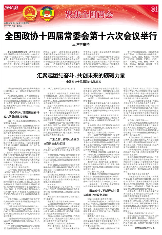 7天时间里,来自34个界别的2000多名全国政协委员齐聚北京,出席全国政协十四届四次会议,在协商民主的广阔舞台上,建真言、谋良策、筑同心,寻求最大公约数、画出最大同心圆,奏响“十五五”开局之年的奋进强音。