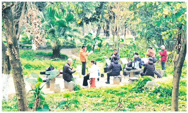 近日,和煦春光里,七星公园的小岛上,一群音乐爱好者围坐在一起,吹拉弹唱,奏响生机盎然的“春之歌”。 记者周子琪 摄