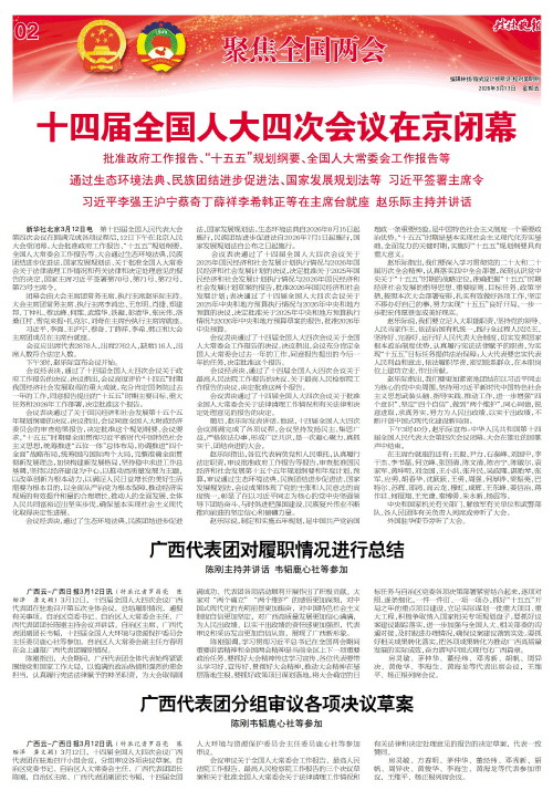 广西代表团对履职情况进行总结 陈刚主持并讲话 韦韬鹿心社等参加   广西云-广西日报3月12日讯(特派记者罗昌亮 陈贻泽 龚文颖)3月12日,十四届全国人大四次会议广西代表团在驻地召开第五次全体会议,总结履职情况,通报有关事项。自治区党委书记、自治区人大常委会主任、广西代表团团长陈刚主持会议并讲话。自治区主席、广西代表团副团长韦韬,十四届全国人大环境与资源保护委员会主任委员鹿心社等参加。自治区人大常委会副主任方春明在会上通报广西代表团履职情况。
