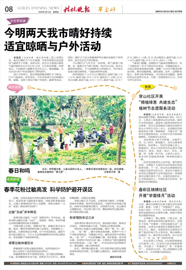 气象部门提醒,近期我市气温虽有缓慢回升,但“日暖夜凉”的天气格局仍未改变,早晚温差较大,当前正值春季流感高发期,提醒广大市民早晚及时增添衣物,做好保暖措施,谨防感冒。此外,近期降水较少,森林火险等级偏高,市民周末外出露营、踏青时务必注意用火安全,杜绝一切违规用火行为,共同守护生态安全。